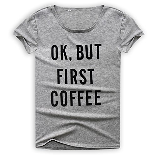 M-Egal Women Short Sleeve T shirt Ok But First Coffee Printed Letters Couple Casual Tee Shirts grey S