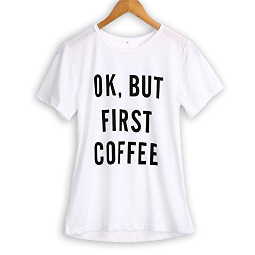 M-Egal Women Short Sleeve T shirt Ok But First Coffee Printed Letters Couple Casual Tee Shirts white M